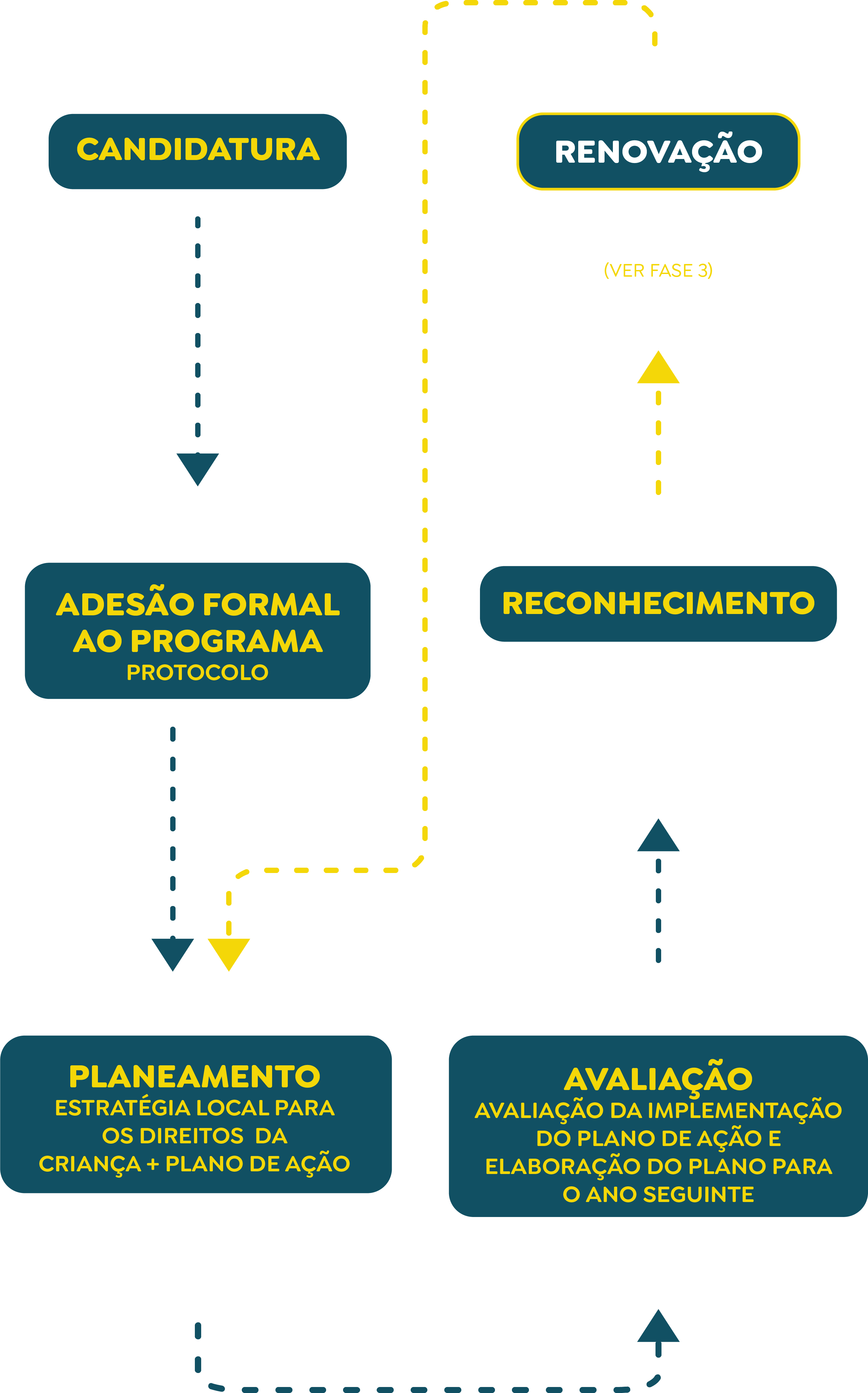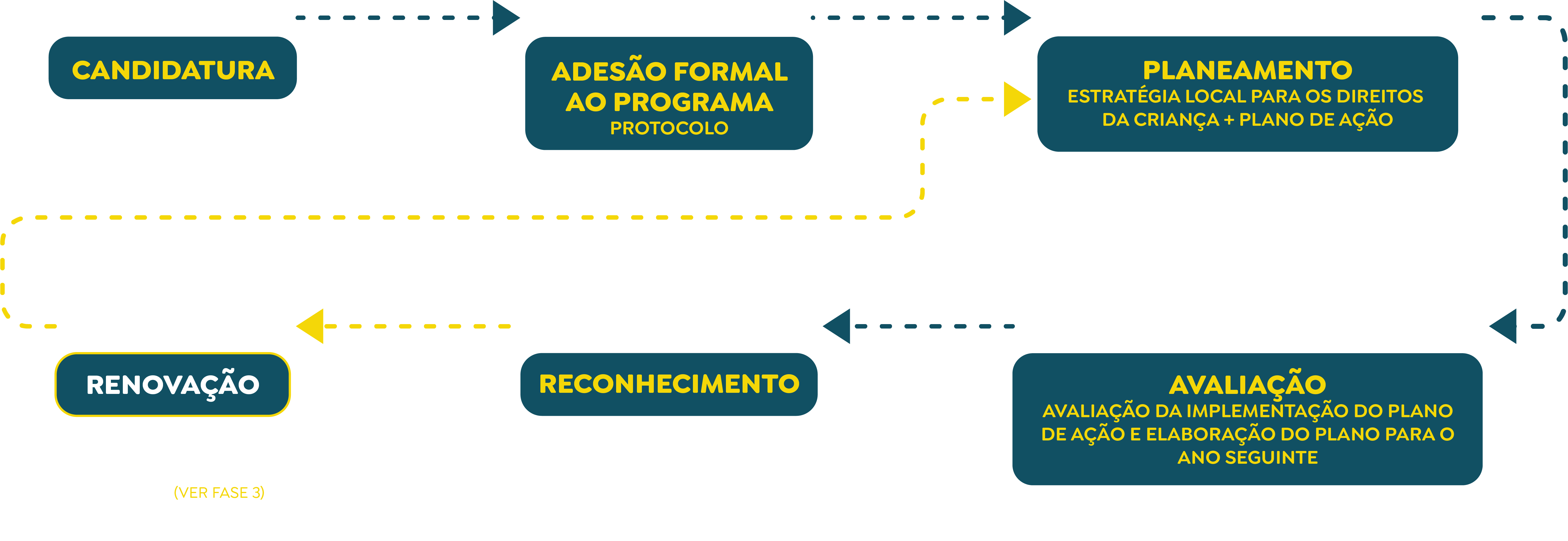 O Programa contempla um conjunto de seis fases, a seguir representadas, que implicam, entre outros procedimentos, a realização de um diagnóstico que fundamente a Estratégia Local para os Direitos da Criança, traçada para um horizonte temporal de quatro anos, assim como os respetivos planos anuais de ação, a que se acrescenta um processo de monitorização e avaliação contínuas, com vista à obtenção do reconhecimento, com possibilidade de renovação.
